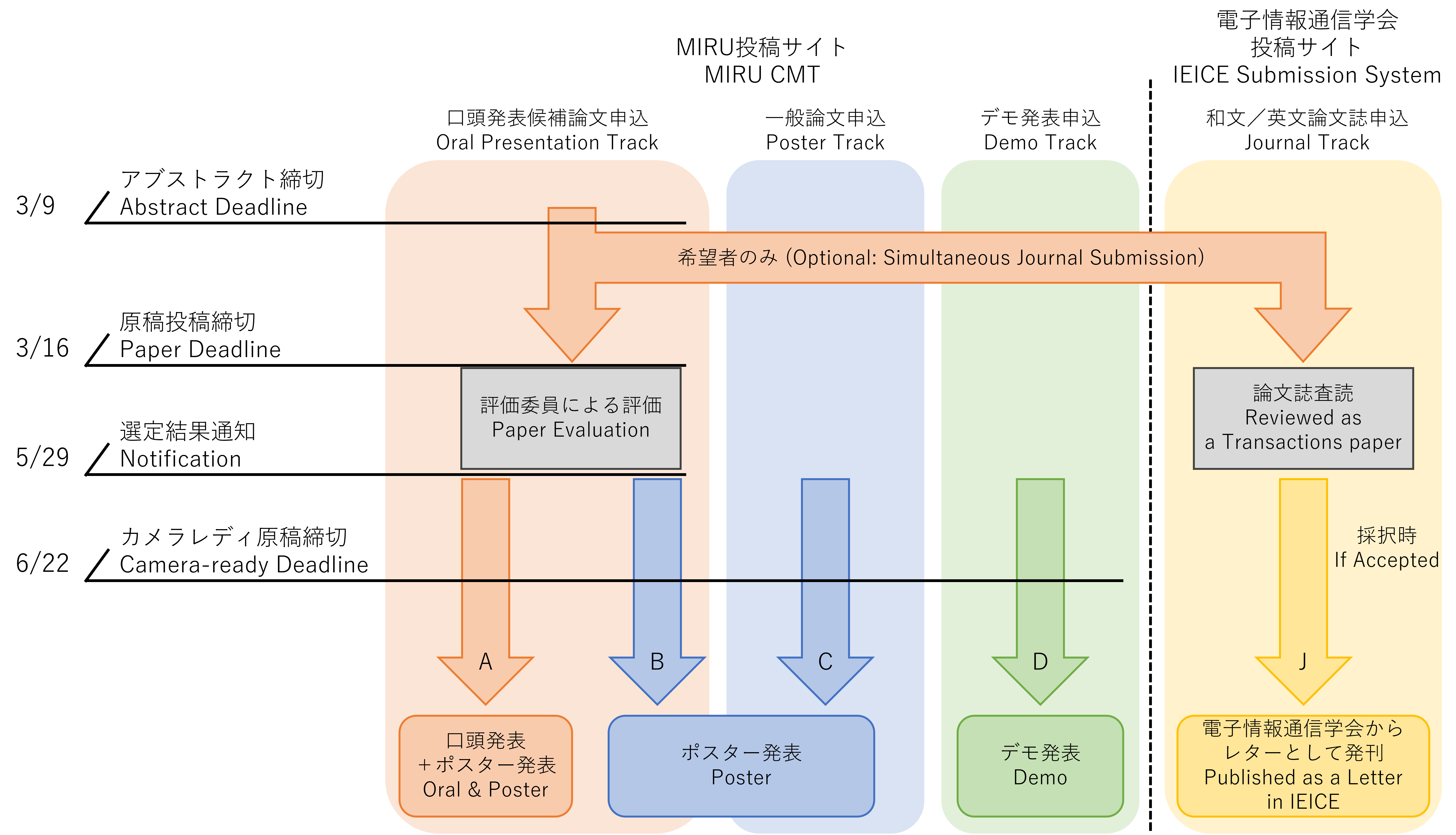 - 口頭発表はカメラレディ投稿時、一般発表とデモ発表については投稿時に、投稿した原稿、および補足資料はそのままMIRU Extended Abstract集に収録します。